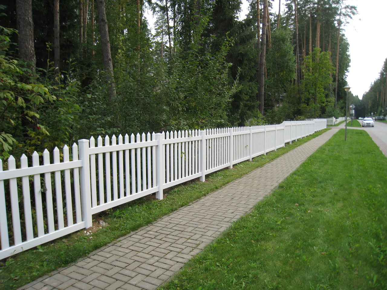 Новое ограждение из ПВХ штакетников с плоскими колпаками сохранило эстетику поселка, но при этом обеспечило следующие преимущества: